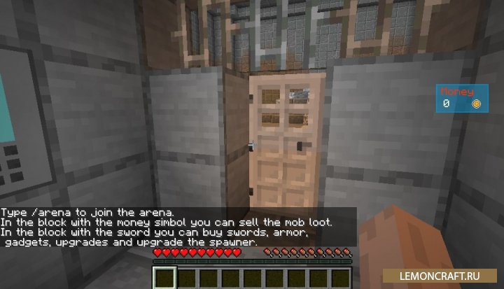 Мод на арену Arena добавляет в игру специальную арену, где вы сможете устраивать сражения с мобами и получать за это плату. За полученную плату вы сможете купить различные улучшения и экипировку. Для попадания на арену введите команду /arena.